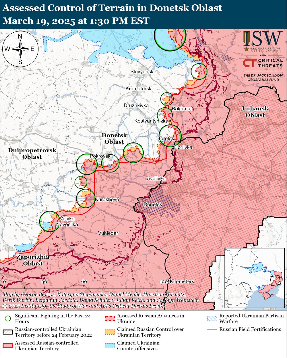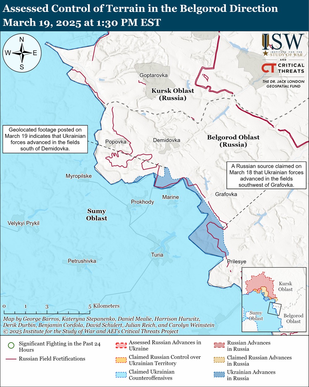 Ukrainian forces have advanced into Russia’s Belgorod Oblast while Russian forces gained ground in several areas of Donetsk Oblast, according to a report published by the Institute for the Study of War (ISW) on 19 March.