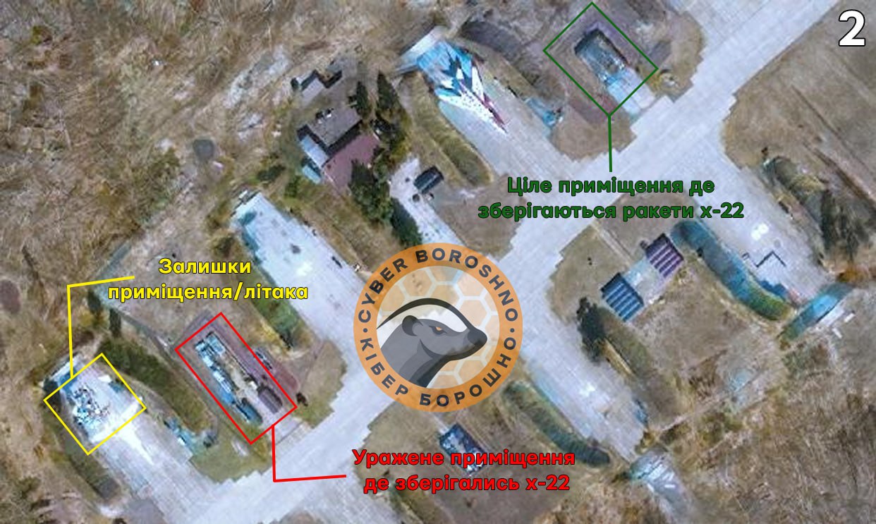 As a result of the strike, infrastructure at the air base was damaged, primarily destroying the facility used for preparing Kh-22/32 missiles, where they were fueled and configured before launch, with the channel indicating that the stationary refueling stations disappeared following the attack, according to satellite imagery.