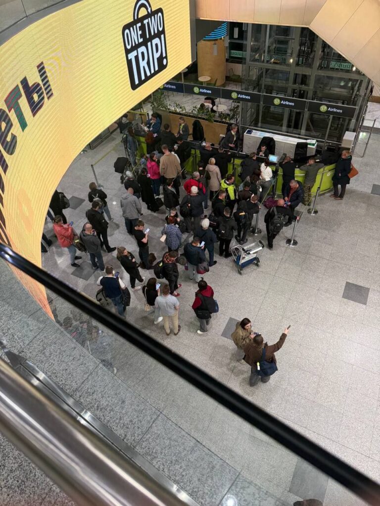At Moscow’s Vnukovo airport, eyewitnesses described information boards “all yellow and red” with terminals so crowded that “cafes are overcrowded, and it’s almost impossible to find a free seat.”